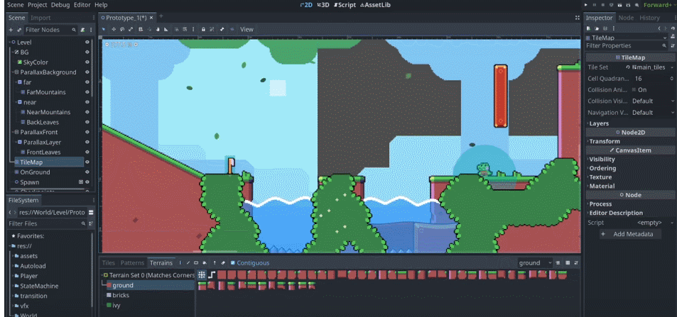 - Improved 2D workflow with the new tilemap editor, which enables fine-tuning of collisions, navigation, pivot points, and other tile properties. It also includes layers, a terrain auto-tiling system, and a scene placement feature.
