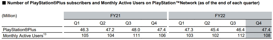 - According to the company’s report for FY22 ended March 31, the number of PS Plus subscribers was 47.4 million — zero growth compared to the end of the fourth quarter of FY21 (March 31, 2022);